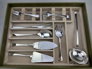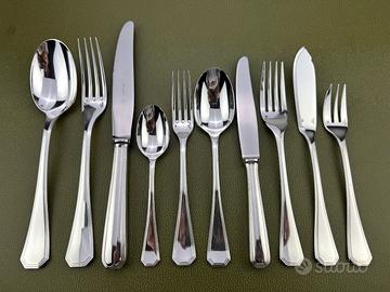 Il set di posate Christofle America è una vera testimonianza del movimento Art Déco. Il suo design trae ispirazione dall'era glamour degli anni '20 e '30, caratterizzato da motivi geometrici audaci e linee pulite e nette che sono un segno distintivo di questo influente periodo di design. Questa straordinaria collezione comprende un set completo per 12 persone, con un totale impressionante di 126 pezzi. Il set comprende tutto il necessario per una grande esperienza culinaria.