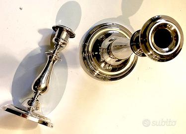 Bella coppia di candelieri a disegno asimmetrico della prestigiosa Maison Chrisofle. Spessa placcatura in argento e ottime condizioni generali con minimi segni del tempo. Altezze: 19 e 25 cm.