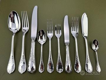 Bellissimo set di posate Christofle, modello Marly. Servizio completo per 12 persone, placcate in argento, ogni pezzo con il marchio del produttore. Questo modello prende il nome dal castello di Marly costruito da Luigi XIV come residenza oasi di tranquillità tra i boschi, per sfuggire al caos e alla frenesia della Corte. Infatti lo stile del modello Marly è tipico di quel periodo e rimanda all'aristocrazia e alla nobiltà di quell'epoca. Questo è uno dei più raffinati e ricercati modelli di questa famosa casa francese, il cui nome, Christofle, è sinonimo di stile e qualità in tutto il mondo.