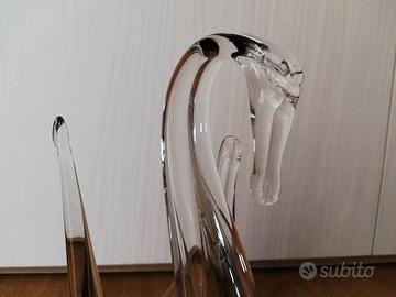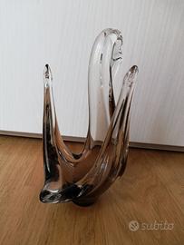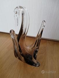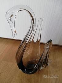Cigno in vetro, trasparente sulla testa e sulla punta delle ali, marrone scuro o grigio alla base, altezza circa 17 cm.