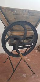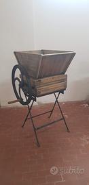 Pigiatrice in fusione di ghisa antica,perfettamente funzionante,restaurata completamente. Rifacimento del telaio portante e l'imbuto per il caricamento dell'uva in legno massello verniciato.