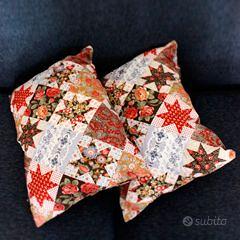 Cinque cuscini con tessuto stampato patchwork, in stile rustico vintage, imbottiti in pura lana e rifiniti a mano.