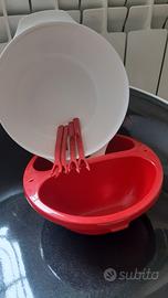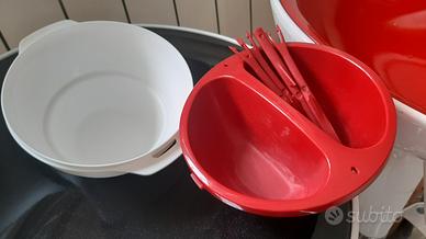 cioccolatiera per microonde della tupperware, composta da una ciotola bianca dove mettere l'acqua, una ciotola rossa a 2 scomparti dove mettere il cioccolato da sciogliere e 4 forchettine da fonduta