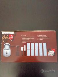 Fornelletto per fonduta di cioccolato, Cioccole' Amstrad per creare cioccolatini, praline e frutta ricoperta. Il dispositivo è alimentato a corrente elettrica 220V. Il kit è completo e nuovo.