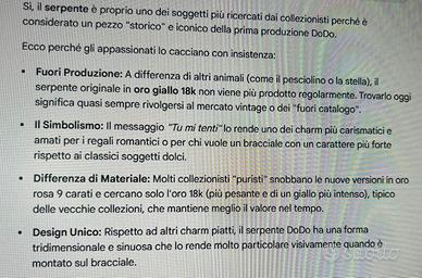 Vendo ciondolo “serpente” oro giallo 18 carati, marchiato DoDo, originale. Ciondolo raro, fuori produzione. Dimensioni 1,14cm x 0,80cm. All’interno della simbologia DoDo, il serpente comunica il messaggio “Tu mi tenti”. Marchiato e certificato DoDo. Con scatola originale