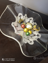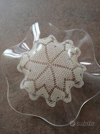 Centrotavola in metacrilato inalterabile ed infrangibile, con inglobato un centrino d'epoca fatto a mano. Diametro cm. 28 altezza cm. 7.