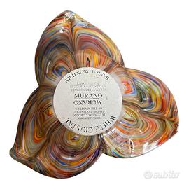 Ciotola decorativa in vetro di Murano dalla forma distintiva a trifoglio, piacevolmente molto colorata, che presenta anche un'etichetta che ne attesta la realizzazione secondo la tecnica dei maestri di Murano e il Made in Italy.