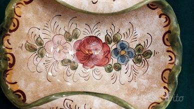 Splendido esempio di ceramica artistica italiana proveniente da Deruta (Perugia), uno dei centri di produzione di maiolica più famosi al mondo sin dal Rinascimento. Il pezzo è caratterizzato da una lavorazione interamente fatta a mano, come testimoniato dalle pennellate visibili e dal marchio sul fondo. Caratteristiche Principali Origine: Deruta, Italia. Materiale: Maiolica (terracotta smaltata e dipinta). Decoro: Classico motivo floreale policromo con una rosa centrale prominente nei toni del rosso/carminio, affiancata da fiori di campo in azzurro e rosa. Il bordo è rifinito con una greca a semicerchi e un profilo verde oliva. Finitura: Sfondo "spugnato" o puntinato color sabbia, tipico della produzione artigianale del XX secolo per conferire un aspetto rustico ed elegante. Marchio di Autenticità: Firmato a mano sul fondo "Deruta C.A." (Sigla che identifica la bottega o il decoratore specifico). Stato di Conservazione L'oggetto si presenta in ottime condizioni vintage. Si noti il piede non invetriato (terracotta a vista), segno distintivo della cottura tradizionale su supporti che ne garantiscono l'artigianalità.