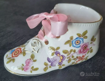 In abbinamento una scarpina in ceramica con decorazioni coordinate a quelle della ciotola. La scarpina ha una lunghezza di 10 cm ed è guarnita da un fiocco in raso rosa che ne esalta la delicatezza.