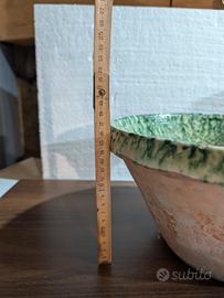 Grande ciotola in ceramica di Caltagirone, lavorazione artigianale siciliana con smalto tradizionale e motivo verde. Ideale come centrotavola, porta frutta o oggetto d’arredo dal fascino mediterraneo.