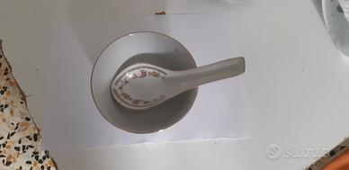 Ciotola in porcellana cinese con decorazione sull'esterno e cucchiaio correlato anch'esso decorato. Oggetto degli anni '50 circa.