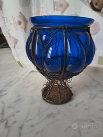Elegante ciotola in vetro color blu intenso, inserita in una solida e decorativa struttura in metallo.