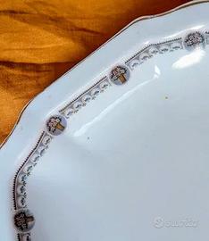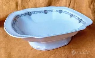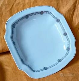 Square footed serving bowl. Oepiag Czechoslovakia. Mark 1918-1920. Ciotola di servizio su piedistallo Marchio Oepiag 1918-1920 (Associazione fabbriche porcellana Boeme. Dalovice) Decoro Jugendstil transferware cm 23 x 23 altezza 8 Condizioni buone. Sbiadite le linee dorate sui bordi .