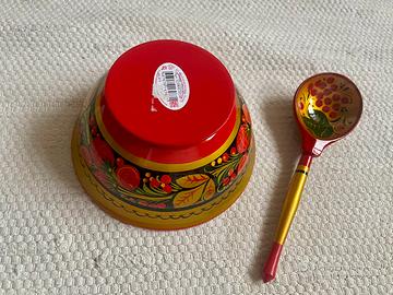 Ciotola e cucchiaio in legno laccato con decorazione a Khokhloma.