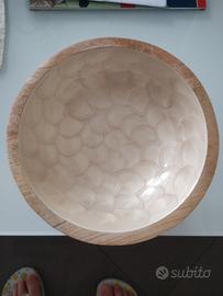 Ciotola media realizzata a mano e completata da un rialzo cilindrico, ideale per ambienti esterni grazie alla finitura speciale che all'esterno presenta la classica trama del legno, mentre all'interno ha un caratteristico effetto perlato. Altezza: 14 cm; diametro: 20 cm.