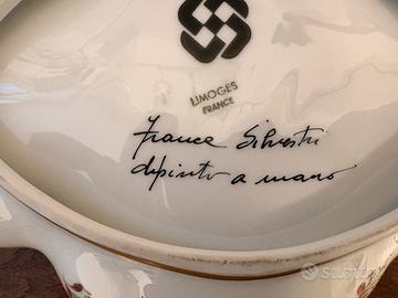 Sul fondo è presente il marchio originale Limoges France e la firma della decoratrice “Franca Silvestri – dipinto a mano”, che testimonia la lavorazione artigianale e rende ogni esemplare unico.