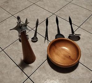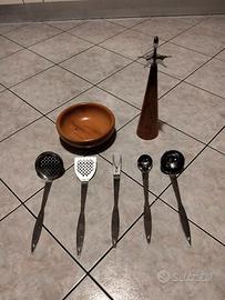 Ciotola in legno, abbinata a porta mestoli in legno/metallo e mestoli, marca Ma.Co Creazioni. Articoli da cucina mai utilizzati.