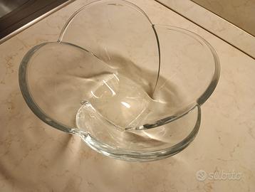 Ciotola in vetro lavorato trasparente, forma quadrata tondeggiante.