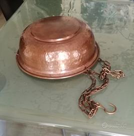 Vendo ciotola in rame martellato vintage, completa di catena in metallo e gancio, ideale come elemento decorativo per ambienti rustici, country, chalet di montagna, agriturismi, cucine tradizionali o come oggetto da collezione.