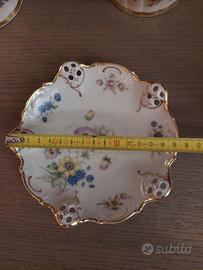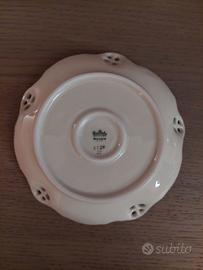 Dimensioni: diametro massimo 15,5 cm, concavo con bordi traforati e bordi in oro zecchino, numerato sottocoperta.