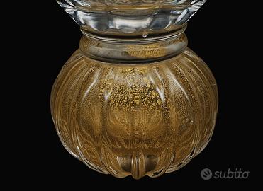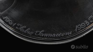 Ciotola svasata, porta caramelle o cioccolatini in vetro trasparente di Murano presentata su una base a sfera con inclusioni dorate. Il vetro di Murano è un vetro artistico tradizionalmente eseguito a mano sull'isola di Murano, a Venezia, noto per le sue tecniche elaborate e la maestria artigianale. Nella ciotola reca una scritta incisa in corsivo elegante, che recita:1989 Francesco Bevilacqua – 1991 Fabio Sannaccone – 1993 Francesco Bevilacqua. La firma appartiene a Fabio Sannaccone, un maestro vetraio. Le date incise, 1991 e 1993, potrebbero riferirsi agli anni di creazione dell'opera o a un periodo significativo nella carriera dell'artista. Sannacc,one è noto per la sua maestria nella lavorazione del vetro, spesso associata alle tecniche tradizionali di Murano, come la soffiatura. Invece per Fabio Sannaccone 1991potrebbe riferirsi a un premio o trofeo, che commemora eventi specifici. L'oggetto è un pezzo unico. Misura: altezza13,5 x diametro 20,5 cm