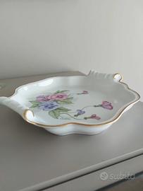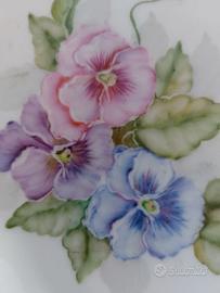 Vendo ciotola-piattino svuotatasche in porcellana bianca con un bellissimo decoro di viole di tre colori sulle tonalità del rosa ottimamente dipinte a mano, con filetto dorato come bordino.