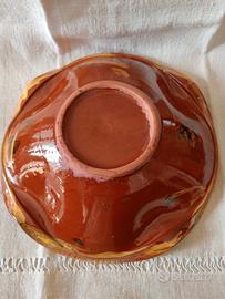 Bellissima ciotola centrotavola / portafrutta in terracotta smaltata con decoro lucido effetto marmorizzato .Orlo ondulato. Fatta a mano e firmata a graffio su un bordo interno . Di grandi dimensioni , diametro di 30 centimetri, altezza 9 centimetri, peso circa 1,5 kg.