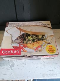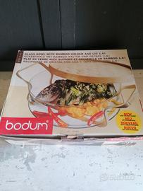 Ancora nella scatola. Vendo elegante ciotola da portata in vetro Bodum Con tappo in vimini e struttura per presentarla in tavola. Perfette condizioni
