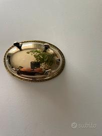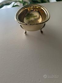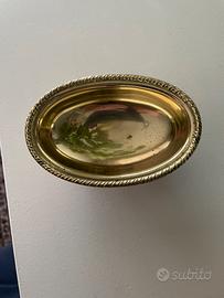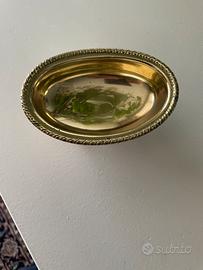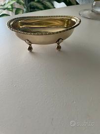 Vendesi elegante ciotola decorativa vintage, caratterizzata da una raffinata forma ovale e bordo lavorato. L'oggetto poggia su quattro piedini a foggia zoomorfa (zampa di leone), che conferiscono stabilità e un tocco classico d'altri tempi.