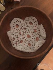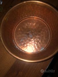 Ciotola anni 70 in rame artigianale da usare come porta dolci o bigiotteria dimensioni diametro superiore centimetri 11 diametro inferiore centimetri 6. Regalo Centrino bianco all’uncinetto fatto a mano