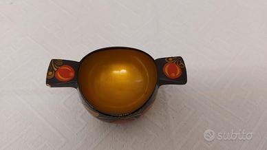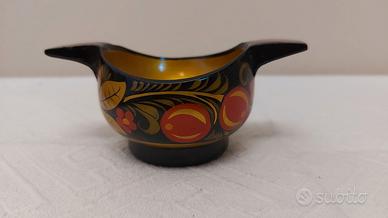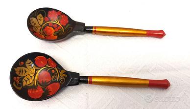 Coppia di ciotole in legno laccato Khokhloma, sfondo nero, disegni rossi e oro, arte russa, legno laccato vintage 5hx7largx11,50 lung Coppia di cucchiai in legno laccato Khokhloma, sfondo nero, disegni rossi e oro, arte russa, legno laccato vintage 18 lung