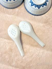 Bellissimo set di 2 ciotole in porcellana cinese con relativi cucchiai, con motivo a chicco/occhio di riso. Colore blu e bianco. Diametro delle ciotole cm 11,5, altezza cm 5,5. Cucchiai cm 14 x 5 x 5 (diagonale x larghezza x altezza). Ottime condizioni vintage. Invio altre foto se interessati