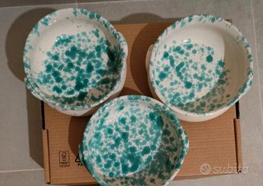 set servizio composto da 3 ciotole in terracotta smaltata schizzata verde acqua, ceramiche artigianali, realizzate e dipinte interamente a mano, eventuali imperfezioni denotano l'originalità del prodotto.