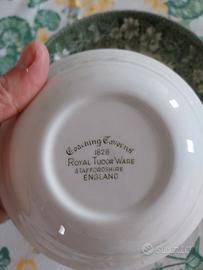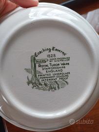 Set di 6 ciotole piccole diametro 12,5 cm e 1 ciotola media diametro 21,5 cm vintage Royal Tudor Ware "Coaching Taverns" Staffordshire 1828, Inghilterra, verde e bianco. Nuove.