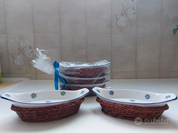 Vendo 5 ciotole per antipasti come in foto si possono impilare e occupano poco spazio hanno un sotto ciotola in vimini in ottime condizioni, mai usate