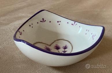 Vendo particolare ciotolina, forma triangolare (larghezza cm. 10) con decoro floreale viola. No spedizioni.