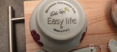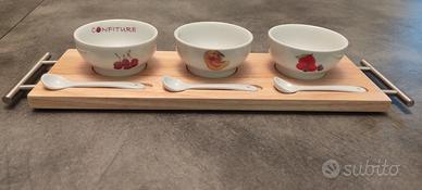 vassoio in legno 47cm. con tre ciotoline 9cm.diametro e cucchiaini in ceramica. Utile per servire marmellate diverse a colazione