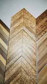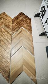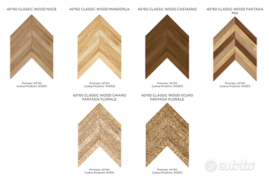 Piastrella da pavimento e rivestimento effetto legno a spina di pesce, formato 40x60 cm- 9 mm.Disponibile nei colori mandorla, noce, castagno, fantasia floreale chiaro, fantasia floreale scuro e fantasia mix.
