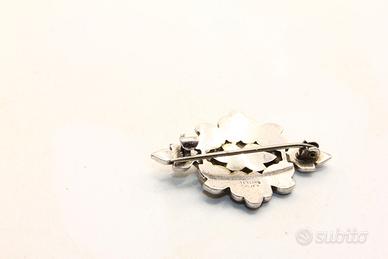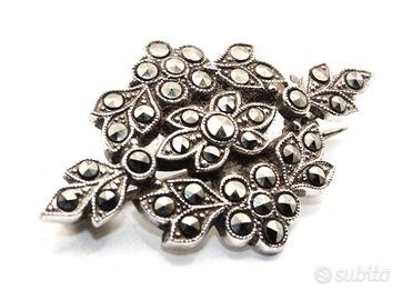 Perfetta per gli amanti dei gioielli d'epoca e per chi desidera aggiungere un dettaglio di autentico stile retrò al proprio look, questa spilla in argento e marcasite è un piccolo capolavoro che racchiude la grazia e la sofisticatezza di un'epoca d'oro