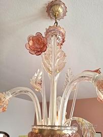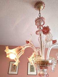 Classico lampadario veneziano in vetro di Murano , 3 luci, colore vetro rosa, arricchito da foglie e fiori. Comprensivo di 2 elementi sostitutivi, un fiore e una foglia. Dimensioni: diametro 54 cm, altezza 90 cm. Ritiro presso il domicilio a Baggiovara (Modena)