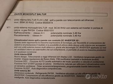 Occasione climatizzatore BALTUR, azienda italiana con sede a Cento (FE), utilizzato pochissimo: 1 unità interna BALTUR FLEX LINE mod. BSM35RX12 con telecomando ad infrarossi; 1 unità esterna monosplit BALTUR mod. BC35RH12 con sistema ad inverter in pompa di calore; Raffrescamento: classe A++ Riscaldamento: classe A+ Corredato di libretto di impianto e dichiarazione di conformità. Comprese staffe per posizionamento a parete unità esterna.