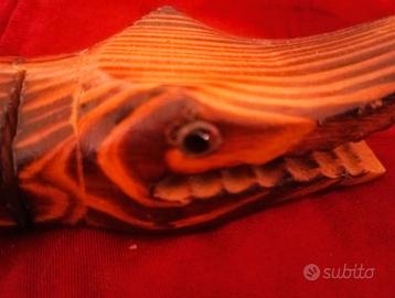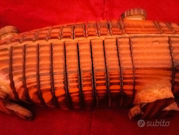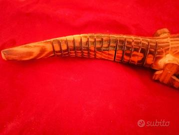 VENDO affascinante scultura artigianale in legno raffigurante un coccodrillo. La particolarità di questo oggetto è la sua struttura snodabile: grazie ai precisi intagli sul corpo, il coccodrillo si muove in modo sinuoso e realistico quando viene maneggiato. Materiale: Legno con venature naturali a vista. Lunghezza: 36 cm. Condizioni: Ottime, integro e perfettamente funzionante nel movimento. Dettagli: Ideale come complemento d'arredo etnico/vintage, soprammobile originale o oggetto da collezione per amanti del legno.
