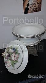 CENTROTAVOLA CON COPERCHIO IN CERAMICA FIORI IN RILIEVO CAPODIMONTE + STRUTTURA IN OTTONE