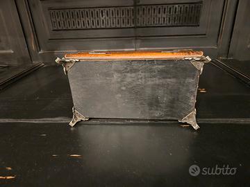 È un cofanetto decorativo in legno con finitura anticata con un orologio funzionante e una piccola cornice per foto.il coperchio si apre per rivelare un vano portaoggetti.