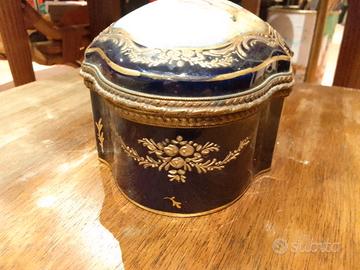 Porcellana dipinta a mano e decorata nello stile del XVIII secolo, raffigurante una coppia di innamorati e firmata Lofrane, colore "blu cobalto", volute dorate in rilievo, montatura in ottone dorato e patinato, con decori floreali all'interno del cofanetto. Sul fondo troviamo il marchio di manifattura francese Château de Longpré e etichetta della ditta "A. Gatti di Alfredo Giannoni" di Novara, primo venditore dell'oggetto. Dimensioni 19,5x13 cm. altezza 9 cm.