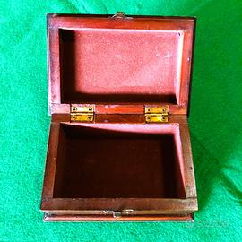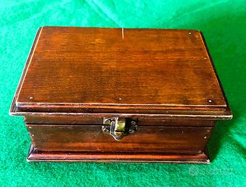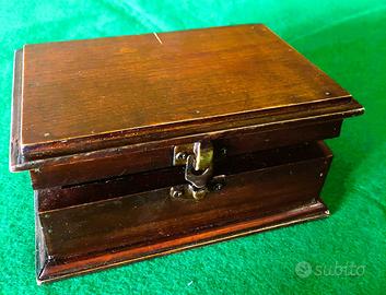 Scatola portagioie, cofanetto in legno vintage, realizzato in legno con finitura scura e accessori in metallo color ottone. Forma rettangolare che ricorda un piccolo baule, con bordi rinforzati. L'interno è rivestito in un morbido tessuto vellutato di colore bordeaux per proteggere il contenuto. Utilizzato in genere per conservare gioielli, orologi o altri piccoli oggetti di valore. Mostra segni di usura e patina di un oggetto vintage o antico. Dimensioni 16,5 cm. X 11 cm. h. 7 cm.