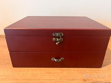Vendo cofanetto Set di vino professionale in legno di colore bordeaux che si compone di due cassetti contenenti 10 pezzi, strumenti legato al mondo del vino.