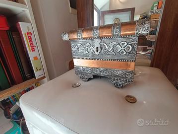 vendo cofanetto stile etnico, esterno in metallo, interno vellutato. adatto come porta gioie misure 12x18 h 15