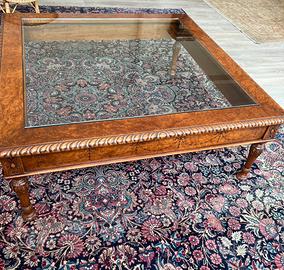 Tavolino caffe, ciliegio intagliato con ghirlande intarsiate sulle fasce, impiallacciato in radica di mirto, e vetro. Dimensioni 120cmx 120 cm altezza 45 cm . Ritiro in zona .