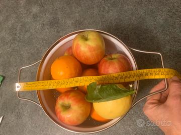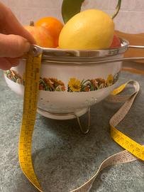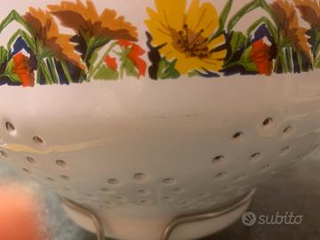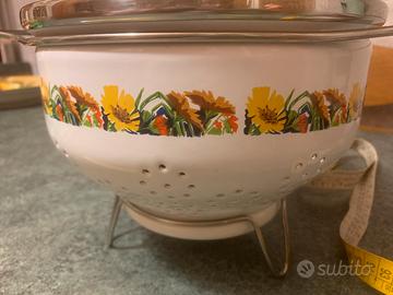 Si tratta di un colapasta smaltato vintage con un motivo floreale, probabilmente risalente agli anni '50. Materiale: Smalto bianco con bordo in acciaio inossidabile. Motivo: Una fascia decorativa di girasoli e piccoli fiori bianchi. Caratteristiche: Presenta maniglie laterali e piccoli fori sul fondo e sui lati per scolare. Stile: Oggetto che rientra nella categoria degli utensili da cucina vintage e da collezione. Essendo un oggetto datato presenta delle imperfezioni, vedi ultima foto